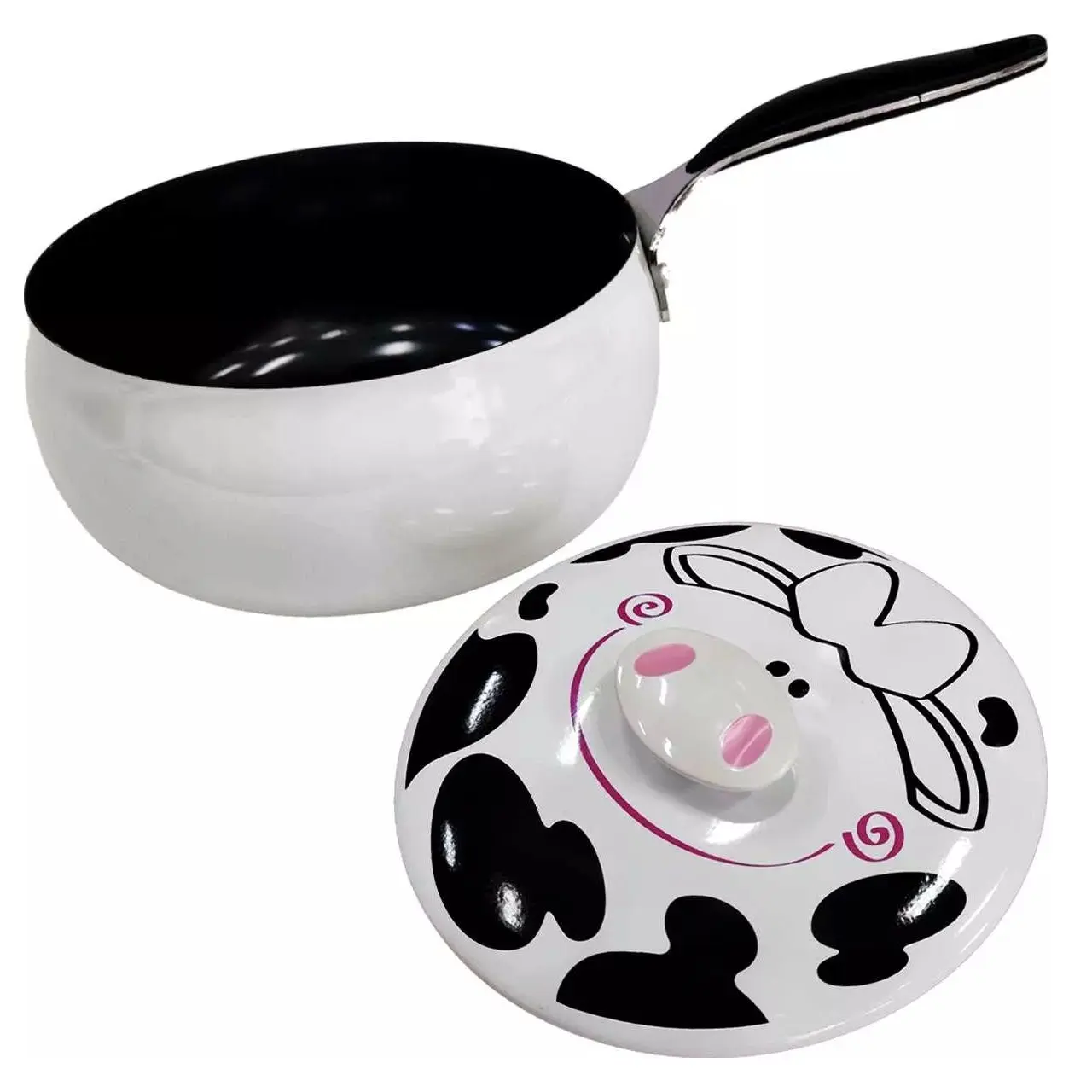 Seu revestimento antiaderente garante um cozimento saudável e prático, evitando que os alimentos grudem, enquanto o design encantador da vaquinha traz um toque lúdico e decorativo ao ambiente.